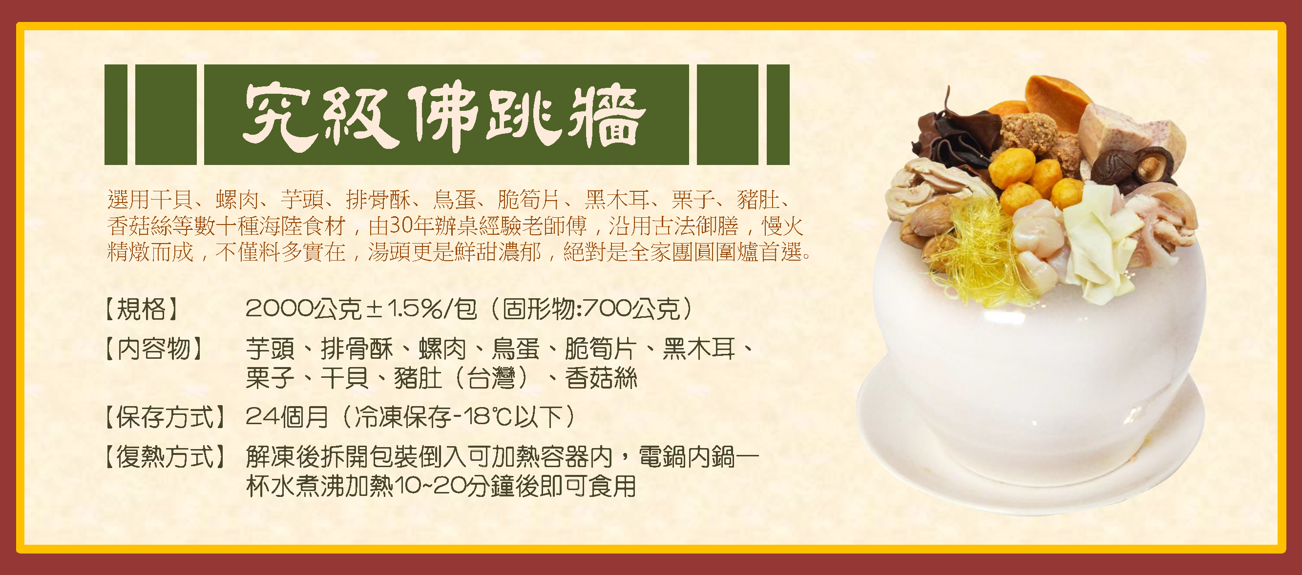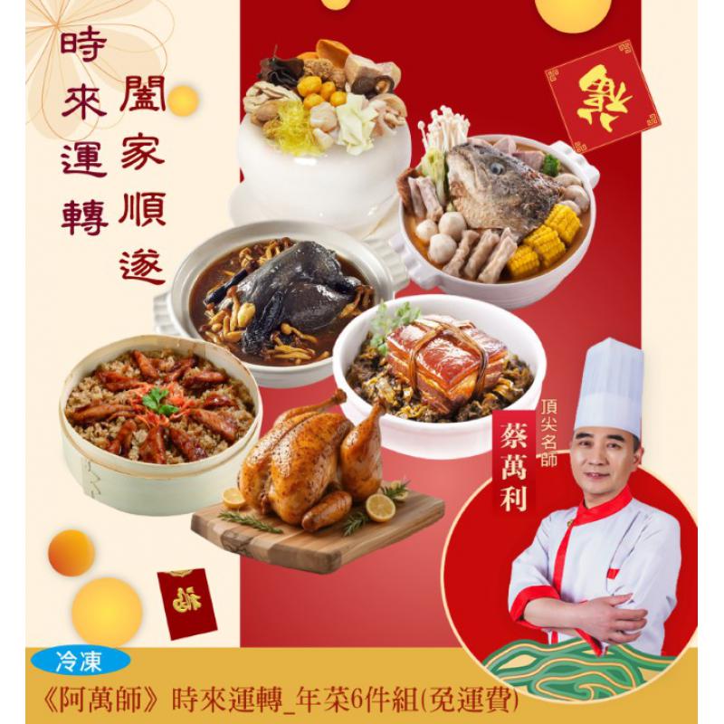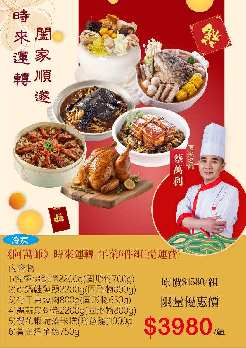 民视美凤有约、中视乐活有方等节目报导,各大卖场、通路指定贩售;由金牌主厨《阿万师》 师傅专业技术指导,严选珍贵食材、精心烹调;六道功夫年菜,海陆料理应有尽有,澎湃年菜帮你送到家,让您立刻变出来好料理、道道色香味俱全,年节阖家围炉轻松上桌!